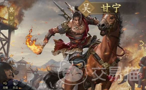 甘宁,带弓、枪兵均可,武力面板非常突出,主动技单体超高倍率武力伤害,对于处于溃散的目标伤害题提升50%,入战获得100怒气。自带技能则是提升主动技20%的伤害,同时每次发动主动技的时候都可以对目标施加溃散,使其持续受到武力伤害。为了可以充分发挥主将技的效果,可以搭配一些其他能稳定提供溃散效果的武将,例如凌统。