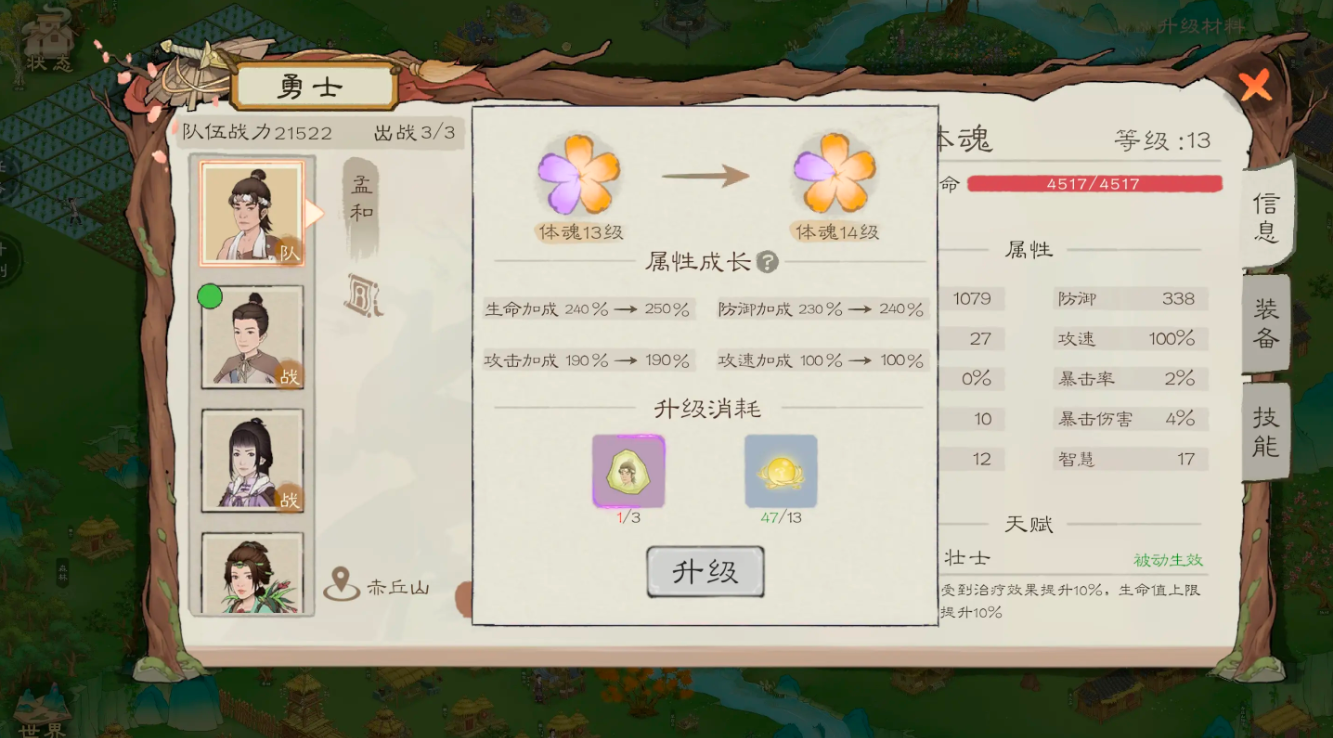 在这款游戏中,玩家们可以感受到田园生活的美好,通过自己的经营让村民们都过上男耕女织的恬静生活,但毕竟游戏的背景设定在古代,乡村附近的凶兽以及天灾人祸的发生都会大大降低居民们的幸福指数。为了应对这种情况,游戏中推出了勇士板块,通过对勇士进行培养,可以使玩家们经营的村庄在面对祸事时有回击的能力。想要培养好一名勇士,可以从多个方面入手,除了勇士自身的等级提升之外,还有装备、宝石以及技能的培养,那么我们就先从勇士自身的培养讲起。在获得一名勇士之后,首先要做的就是对它进行升级,这样可以让默认属性得到极大提升,装备和宝石也会吃到这一部分的加成。