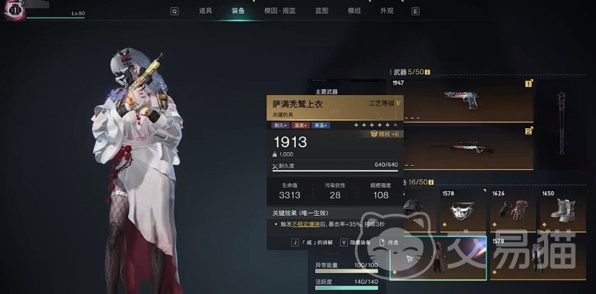 服装选择的是秃鹫套装,它的关键效果就是在激活爆弹之后直接增加三分之一的暴击率, 其他五个部位都可以使用孤狼套装,如果不齐的话也可以随意穿一个堡垒套,或者是三个孤狼,两个拯救;孤狼套有着很好的暴击词条效果,而且穿搭四件都不会丢失,拯救套血量必须高于70%才能吃满,大家可以自己考虑搭配。