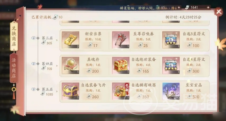当玩家在夜游活动当中获得大量的奖励券,那么就可在商店当中兑换,此商店共有5层,每层的要求都完全不同,只要满足了相应的数量要求之后就能开启并成功兑换,比如在第5层时需要1035张优惠券。只要轻松满足要求后就能获得相应的宝箱以及武器。