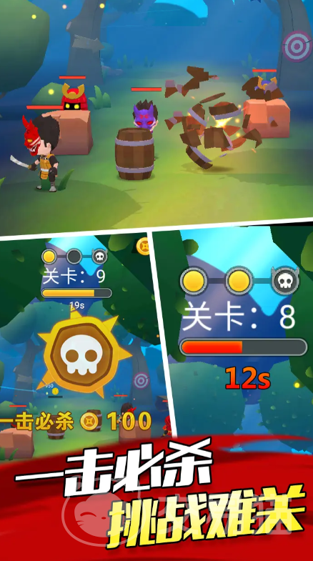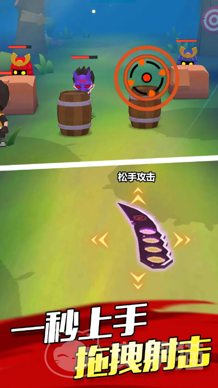 《忍者刺杀》采用第一人称为主要的视觉方式,给玩家制造了多个关卡挑战,游戏的玩法操作非常简单,玩家只需要通过滑动屏幕和锁定敌方单位,对敌人进行击破即可。
