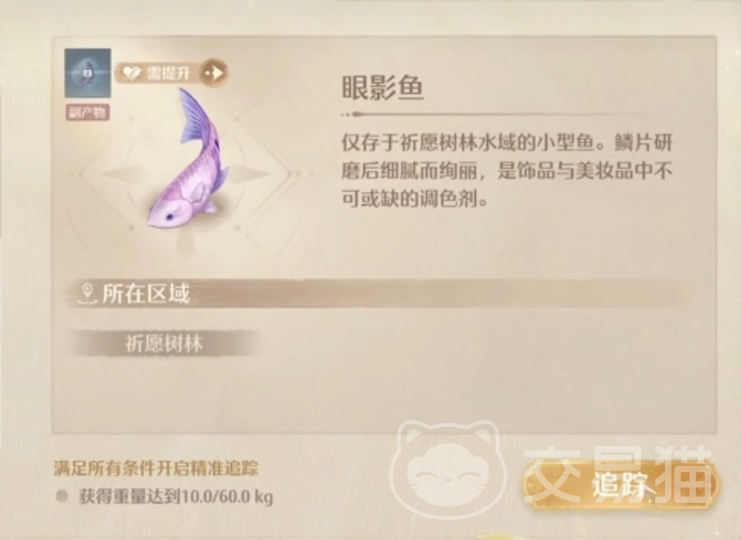 收集眼影鱼也不是为了观赏,而是为了完成以下套装的制作:心愿金蔷薇、星愿璨梦、利落仪表、绯红绮梦、金色晨曦、心愿手礼。其中“金蔷薇套装”需要累计3公斤的眼影鱼。