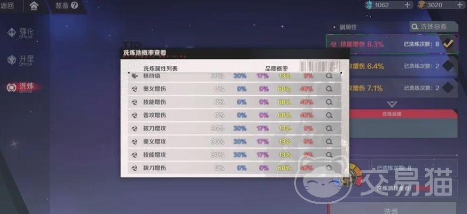 洗练系统大家要是注重的话,其实建议按照增攻>破坏值>增伤这样的顺序来提升效果,在图片右上角有一个洗练查看装备附带的可洗练词条的功能,通过这个功能可以看到大家的装备将洗出什么副属性,因此在前期可以通过普通深渊来刷出主属性为攻击力的装备,凑齐一些好的羁绊,需要注意的是,上位武器所需的强化材料远远高于中位武器,由于缺乏强化材料,强化等级较低的上位武器的攻击力可能还不如中位强化满的装备高,因此在换上位武器之前务必要特别注意这一点。
