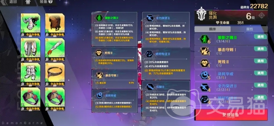 狼影之赐6件套可以在连续3次暴击后,使攻击生成拥有30%生命的幻影并提升10%的攻速,进一步增强了狼哀的输出能力,而死线衣则能将所有造成的伤害提高23%,同时受到的伤害也提高20%,此外,4全力突进、4绝对专注和2压制的搭配也为狼哀提供了强大的战斗增益,全力突进4件套可以在使用冲刺后增加18%的攻击强度,持续10秒,这无疑为狼哀的爆发输出提供了有力支持。