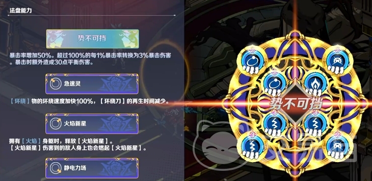 当队伍上阵时,选择势不可挡这个法盘无疑是一个明智的选择,这个法盘带来的效果是暴击率增加50%,而且超过100%的每1%暴击率都会转换为3%的暴击伤害,此外暴击时还会额外造成30点平衡伤害,这使得整个队伍的暴击成为了输出的重点,而在异能的选择上,狼哀可以携带血战到底,这个异能能够增强其生存能力和持续战斗的能力。