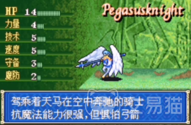 这是一种骑着天马在天空中行走的骑士,有着强大的移动能力。并且对抗魔法的能力很强,而且对弓箭感到很惧怕,是个较为擅长空战的角色,不过很容易被弓箭手射下来。