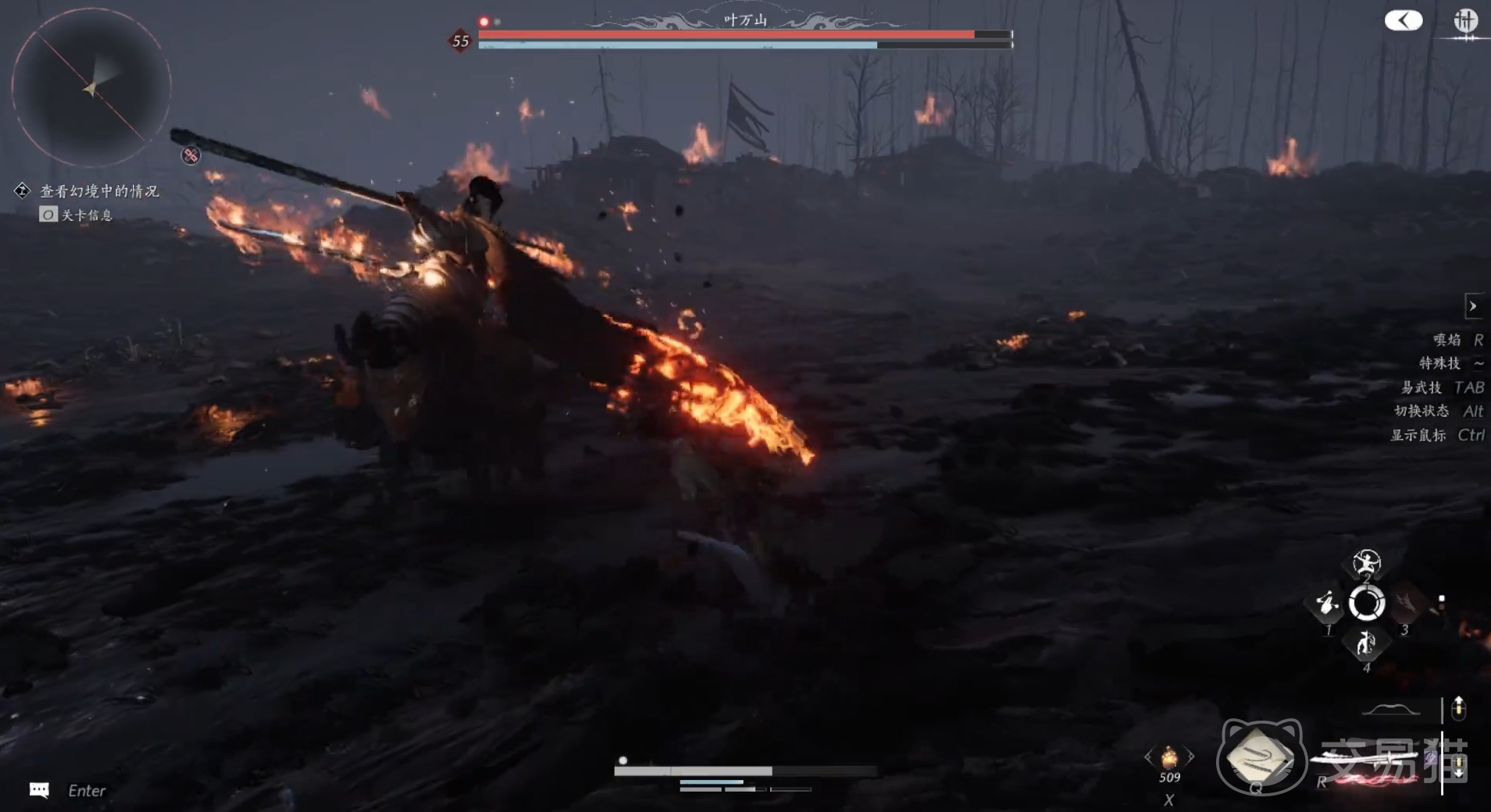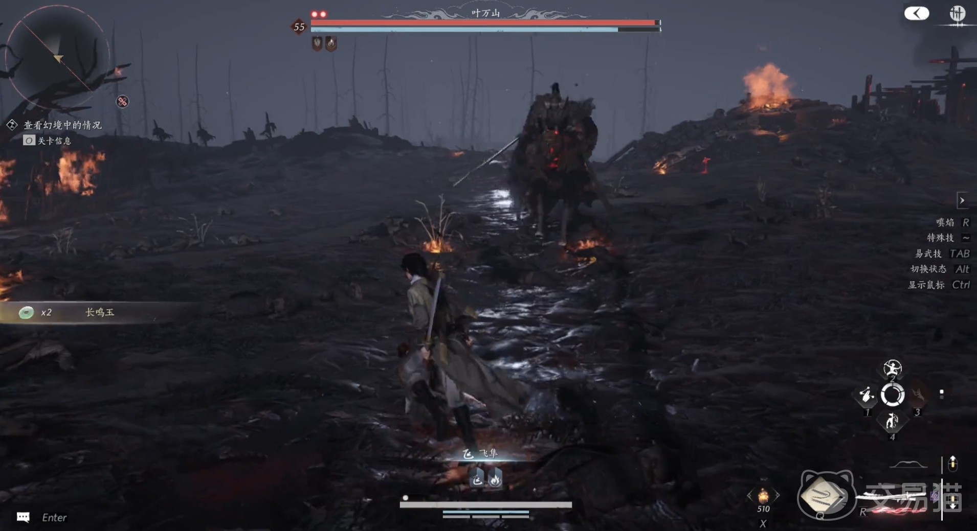叶万山共有两个形态,每个形态都会骑着马向玩家发动冲锋,或在马背上拿着大刀向玩家劈砍,在二形态时还会多一个将大刀掷出并跳到掷出位置的招式。这些招式都不算特别好格挡,比较实用的办法是直接进行闪避,并用扇子进行远攻慢慢将叶万山的两条命都给磨掉。