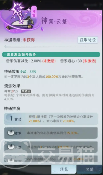 在前期过渡阶段,大家可以选择紫雷鞭和亮银索 这两种紫色神通。这两招能增加暴击概率,并且降低敌人的防御,有助于提升伤害,非常适合过渡到神霄流派。