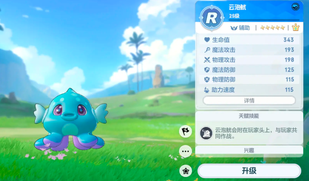 宠物的选择也是有一定技巧的,注意最好选择闪光的,也就是那种全身会散发金光的,它们会自带天赋能增加初始的攻击力,不过遇到的几率不会太高,尽力而为即可,然后这边也给大家推荐几种好用的,首先是输出类的有云泡鱿和幻火狐,云泡鱿能挂在我们的头上化身成无限子弹的机关枪进行输出,建议提升到五星;