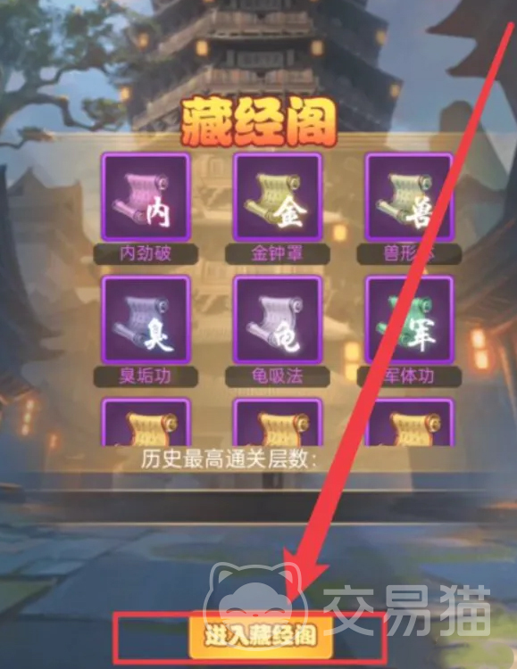 了解完基础的玩法后,我们就可以打开进入藏经阁的页面。这时就会显示我们历史通关的最高层,显示当前已经获得的各种武功心法。到了第二步的话,我们就可以随机匹配一个帮助我们作战的藏经阁弟子,当弟子的地位越高的话,那我们最终获得的收益也会越高。