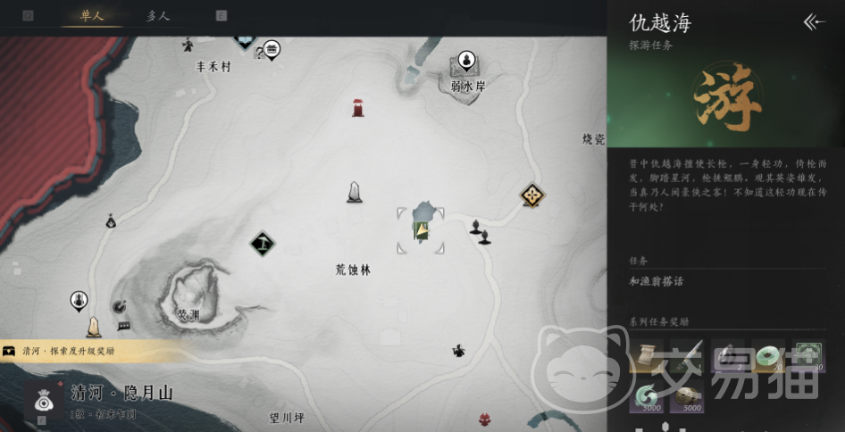 要想得到飒沓流星,肯定首先得找对地方,大家打开地图去到清河·隐月山,找到下图中的位置,然后去找到一个老渔翁,靠近他和他进行对话,对话完毕后你就能开始仇越海这个任务了,这是不可略过的第一个步骤哦。