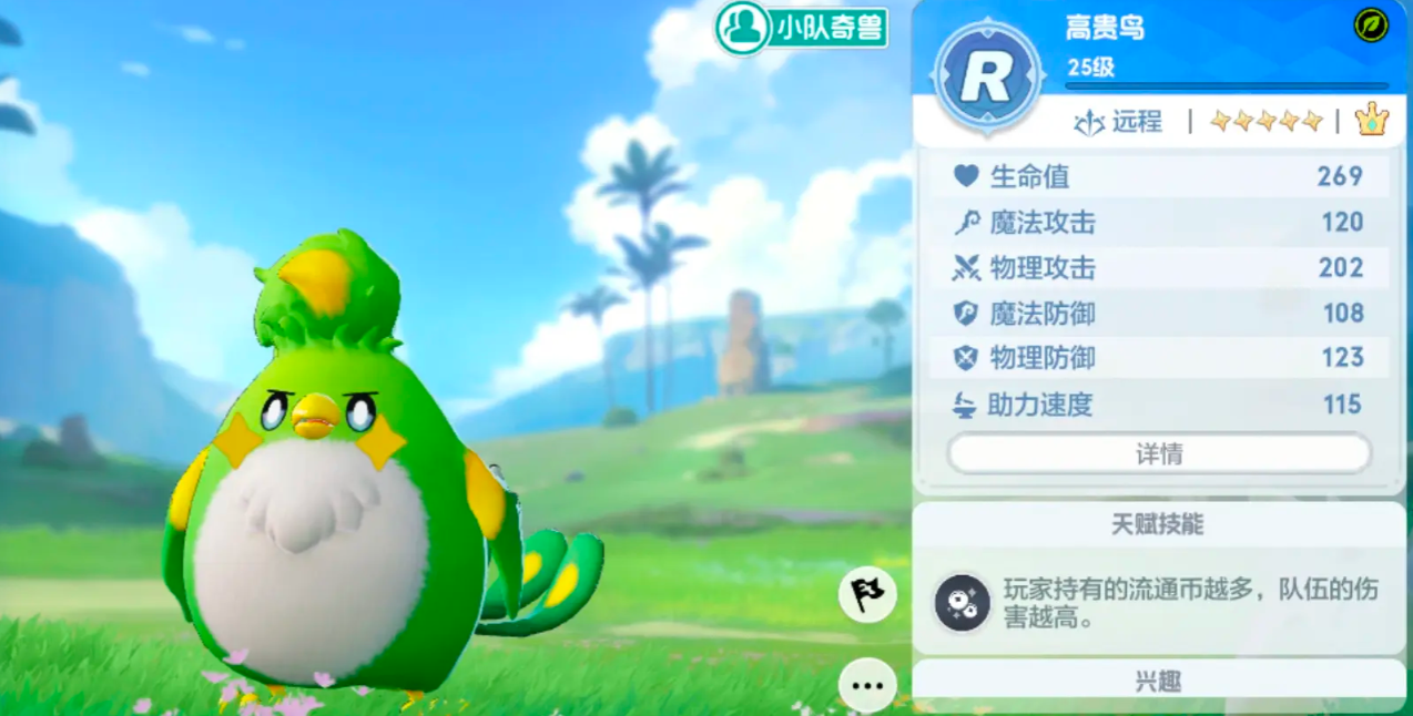 最后的辅助推荐选富贵鸟或者是耀光龙,富贵鸟的被动能永久提升9%的物理攻击和魔法攻击,并且它还有魔力财宝的技能,当我们手上有一定的流通币后还能额外提升物理攻击,是物理队的主流辅助。