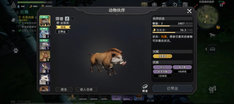 骑上二师兄后,也是比较简单的,找到树木,直接对其冲撞,就能获得对应的经验了,多次进行砍树和矿石采集的操作,就能迅速累计经验了,不过需要记住,不管是山羊还是野猪,都有饱食度,需要将其喂饱后,它们才能进行工作。