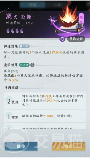 离火这个派别就是靠着持续的灼烧状态,从而让敌方承受高额法术损伤,如果想走法伤的路线,那么可装备任意两个神通就能解锁,每装备上1个该系列神通,灼烧造成的伤害就能提高10%。