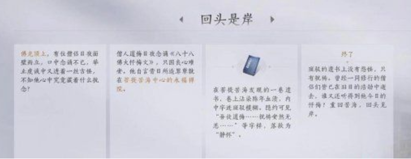当回头是岸这个任务触发成功之后,玩家根据指引要去菩提苦海。到了以后在门外拾取到斑驳的遗书,其实斑驳的遗书是道具也是特别重要的。如果玩家成功的获得了斑驳的遗书,那么就需要去找柳道悔npc,然后跟他对话再提交任务,此时财代表任务的完成。