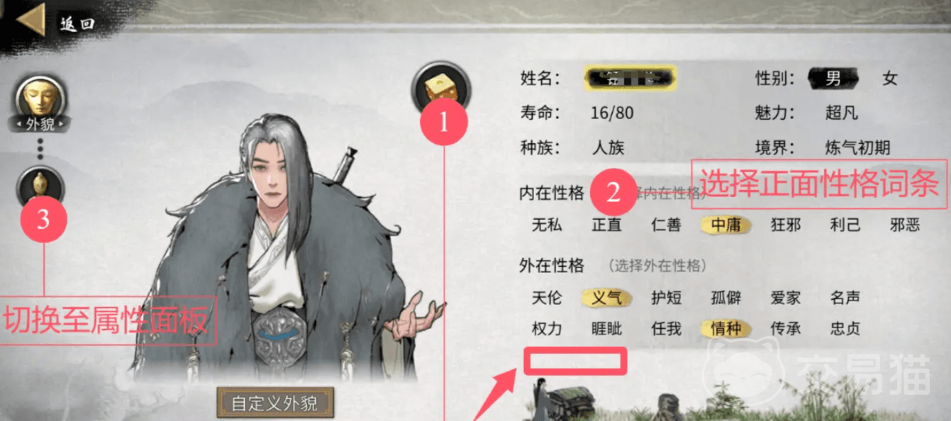 选择完难度后就会进入人物创建的页面,捏脸上大家选择一个自己喜欢的造型,魅力值不要太高或者是太低,这样能避免很多不必要的麻烦,性格上建议选正义等正向的,新手前期千万不要挑战较难的邪道角色,属性上将剑和幸运提升到最高,其他的可以随机,因为幸运和悟性都是后期不太好提升的,而剑属性对前期很有帮助。
