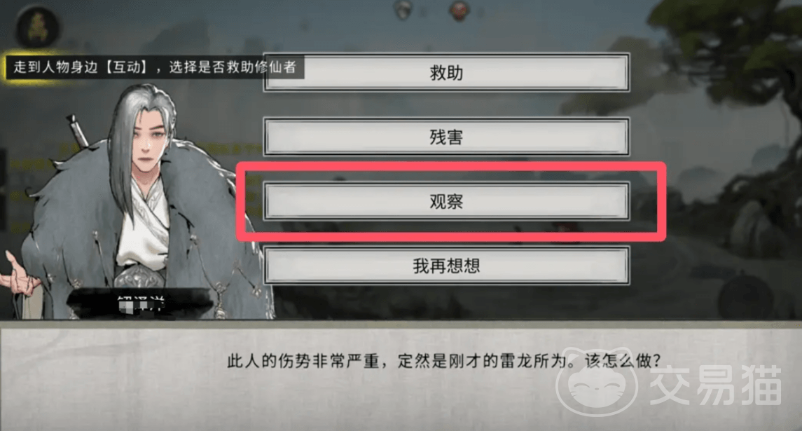 在正式开始后会出现各种事件,比方说刚开局的两个人,会让大家选择救还是杀还是无视,类似这种会出现很多,大家看到时先走到NPC的旁边点击互动,这时会出现四个选项,点观察,这个观察主要看性格和身份,也可以看看人际关系等,大概的原则是好人就选择救,和好人关系上升,在战斗中死亡可能会被救下,不浪费复活机会,坏人选择无视或者杀,尽量能不杀人就不杀人,决定要杀的时候看看人际关系后面有没有强大角色在撑腰,判断在日后被人寻仇后能不能打过。
