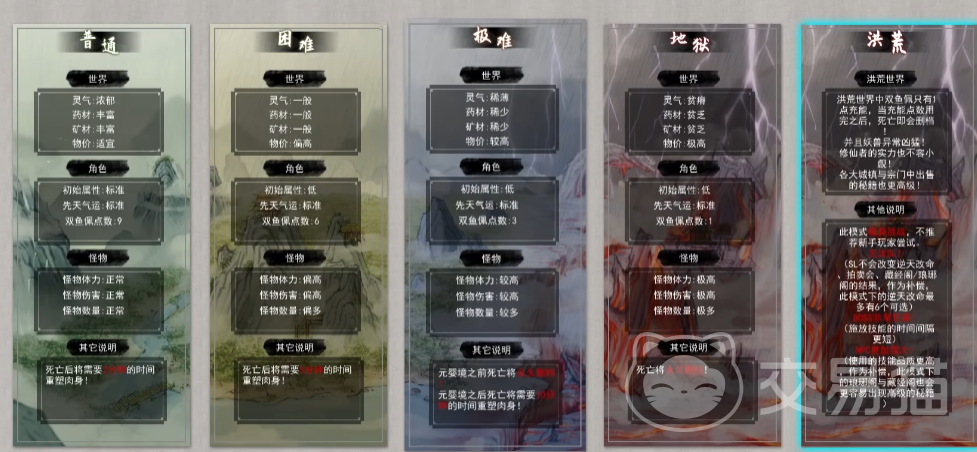 首先和大家明确一点,这是一款开放沙盒类型的修仙作品,简单点来说就是需要先创建好自己的角色,然后再去探索大世界,而想要探索的话,那在刚开始就需要先去选择难度,难度的话建议选择普通开局,不要选择困难或以上,也不要选择简单,这是因为简单玩起来会过于轻松,没有什么代入感,而困难以上的难度又太难了,会导致体验感急剧下降,因此选个普通就可以了。