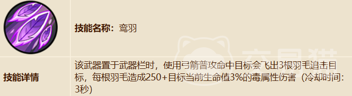 飞羽之痕的核心技能鸾羽是它的灵魂所在。每次普攻命中目标时,有3根羽毛自动追击目标。每根羽毛造成250点固定伤害外,再附加目标当前生命值的3%作为毒属性伤害,技能冷却为3秒。这里要特别强调,当前生命值的3%”是飞羽之痕的一大杀手锏。对高血量的敌人效果尤为显著,尤其是BOSS战中,这种百分比伤害可以在拉扯中快速磨血,配合毒属性还能进一步压制敌人的恢复能力。