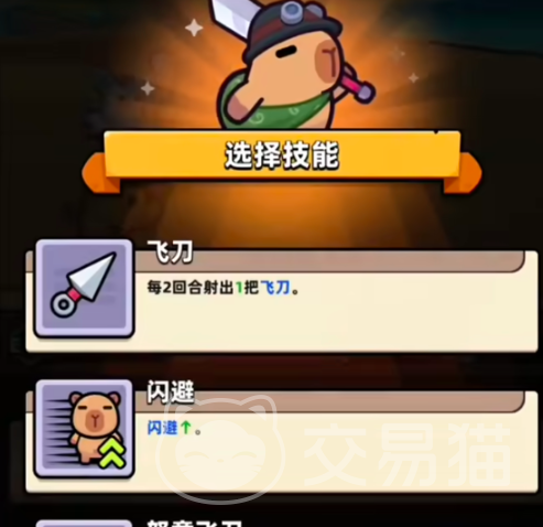 卡皮巴拉这个角色在游戏当中的配置还是非常不错的,目前拥有三大基础技能,分别是飞刀闪避和怒易飞刀,飞刀技能的话每两个回合就可以使用出一把飞刀能完成远距离作战闪避就可以躲避大量的伤害,弄一飞刀的话不仅在两回合中可以出一把飞刀,而且飞刀还可以增加怒气值,触发更多的基本技能,在角色中卡皮巴拉还有着自己的坐骑是一只小鳄鱼,玩家通过这个坐骑能够恢复生命值,并且提高攻击指数,对决效果更加理想。