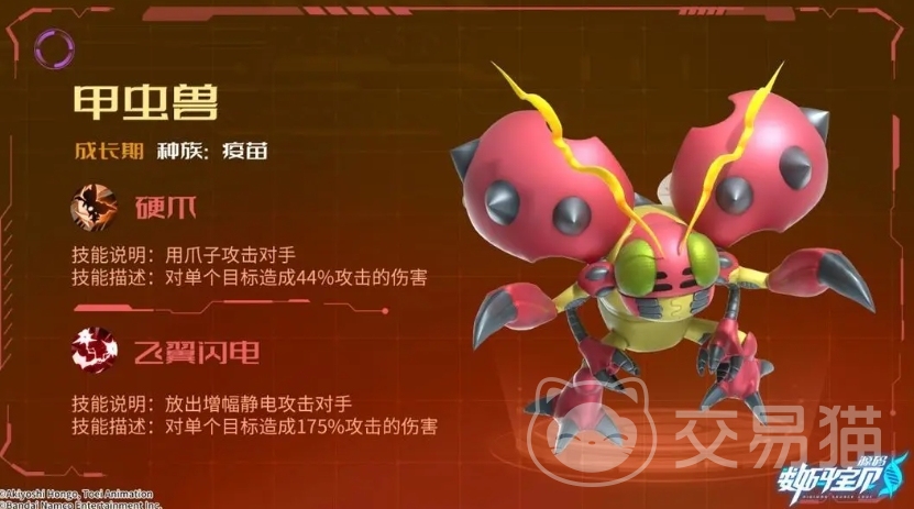 被击中的目标将会承受高达175%攻击力的巨大伤害,同时伴随着强烈的麻痹效果,使得对手在短时间内无法动弹,飞翼闪电不仅是甲虫兽在远程作战中的重要手段之一,也是其在关键时刻扭转战局的关键所在,通过灵活运用这两种截然不同但又同样致命的能力,甲虫兽能够在各种战斗环境中都灵活的跟其他数码兽配合,其实在初期的成长期,甲虫兽便展现出了不凡的电系潜能。