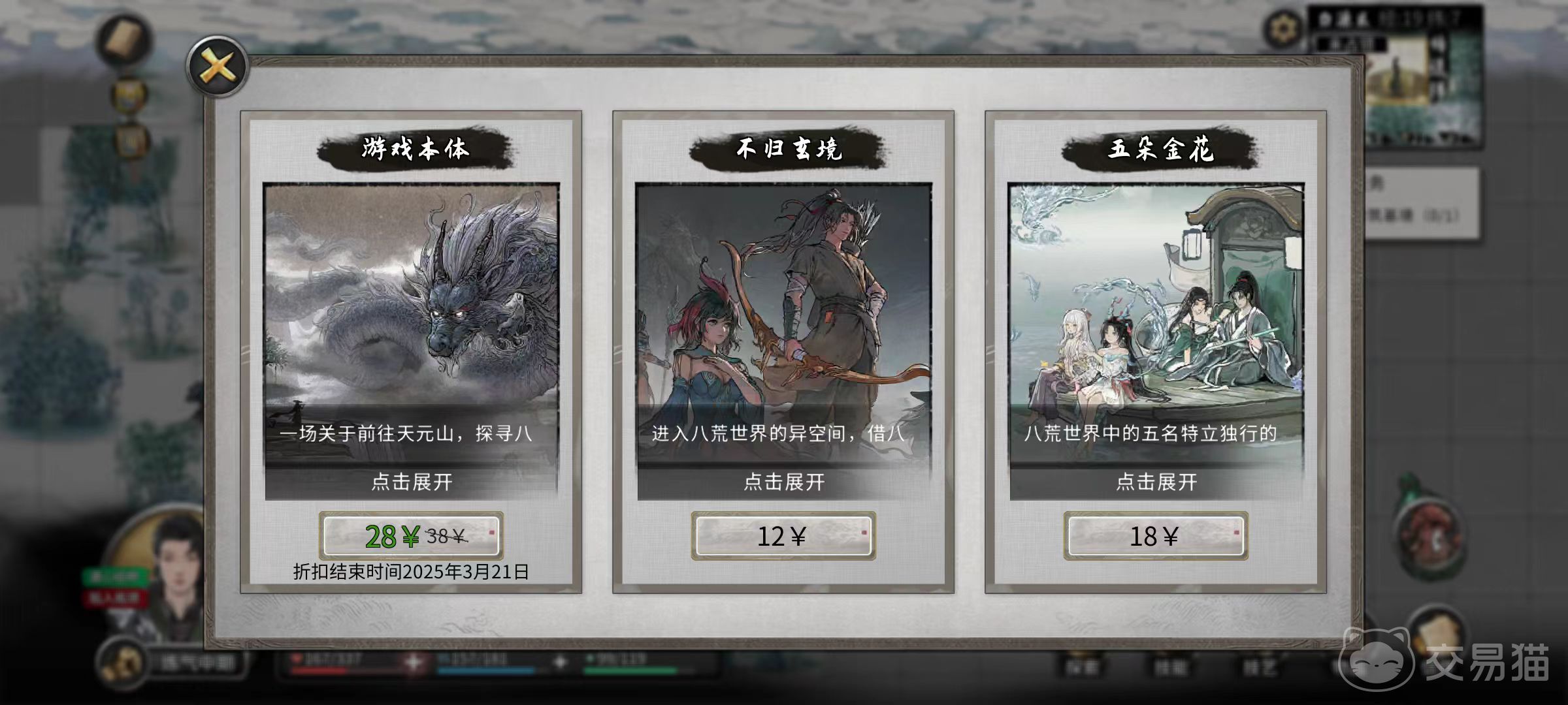 现在本体售价原价是38元,但是目前正在处于首发折扣优惠期之内,这个优惠期长达三个月,涵盖暑假和春节,所以学生玩家假期加入进来也完全合适。折扣价格为28元,已经非常优惠,至于另外的DLC售价,目前一共有两个,因为不归玄境出现时间早一些,所以现在12元就能拿下,五朵金花则是全新推出的内容,所以需要18元。这两个dlc都是互相独立,是游戏原版附加内容。