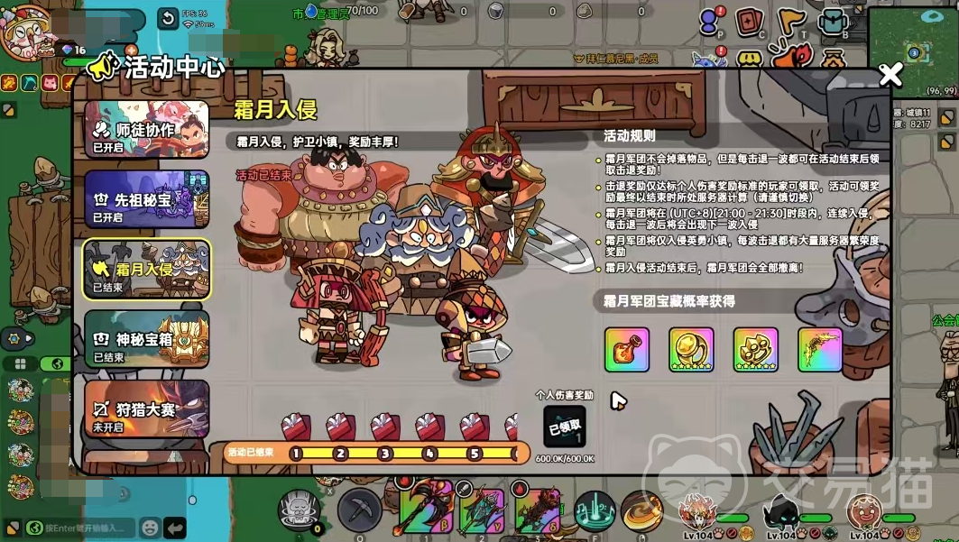霜月入侵这个活动会在特殊的时间开启,通常来说是20:00和21:00,每次活动半个小时。到达时间点后,大家可以随机进入小镇、荒漠和森林中,进入以后只要击败霜月兵团就算胜利。活动结束以后还会获得六星装备或其他物品,大家选择拾取即可。