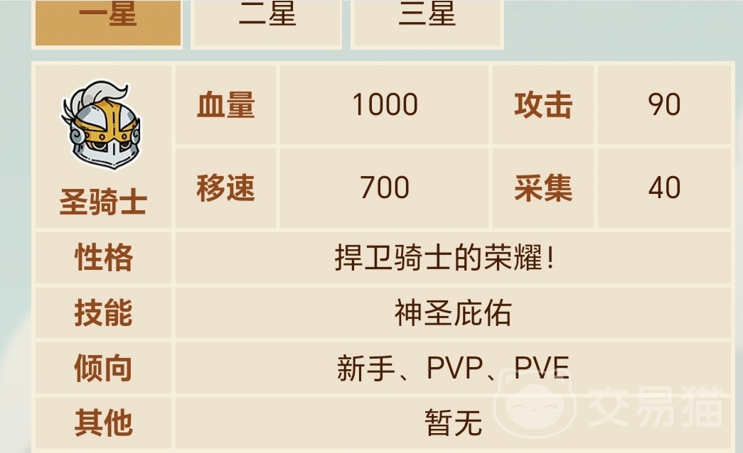 一星圣骑士的血量就高达1000、攻击伤害也达到了900、移动速度则为700,采集速度比较低只有40,到了二星后,所有的能力全部都翻了一番,血量由在1000的基础上由增加了150、攻击伤害也增加了10点,变成了110点,移动速度和采集速度没有变化,等圣骑士升到三星以后,他到底血量以及攻击伤害又各自增加了250点和10点,移动和采集没有变化。