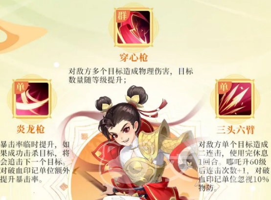 每当说到哪咤,人们总会想到手里拿着炎龙枪,此游戏也将该武器融入其中作为单体伤害技能,暴击率随着角色等级提升也会有所增加追击下个目标造成额外攻击。三头六臂属于专项技能,可对单个目标造成连续两次攻击,当升级到60级之后,攻击次数会直接加。