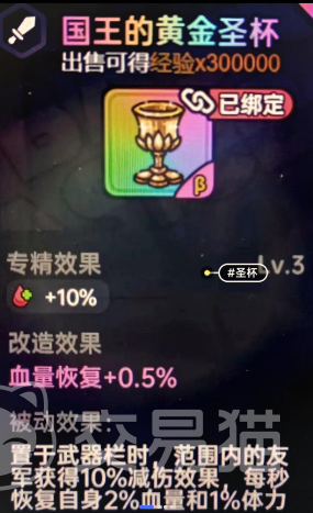 在携带时,那么就可以获得唯一的光环。一旦在获取之后就可以获得很多的作用,除了可以获得减伤效果之外,每一秒可以恢复2%的血量,还有1%的体力。一旦在通过关卡之后,就可以得到对应的奖励。