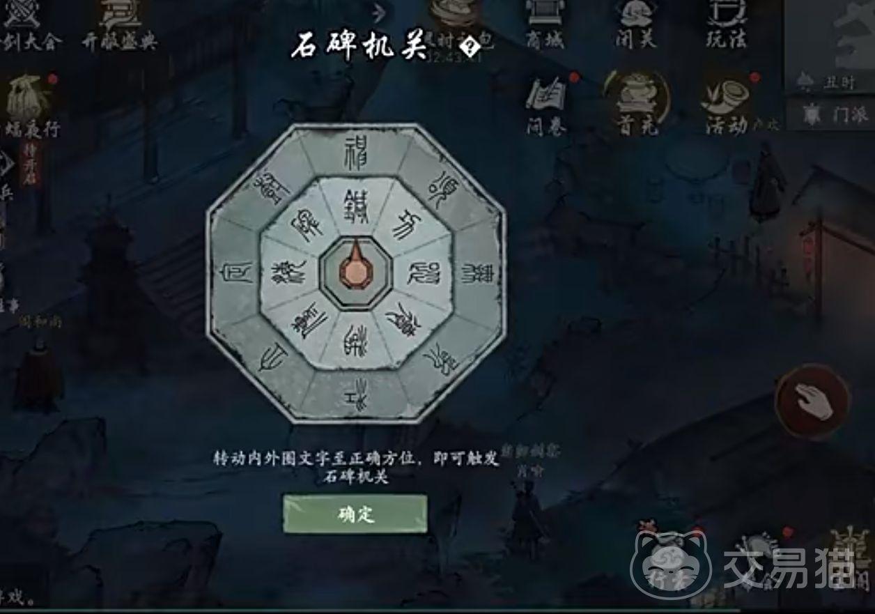 我们是需要根据游戏的时间来进行任务的,游戏里面的一个小时现实里面之后过十分钟,所以我们要算好时间,大家到时候根据自己任务开启的时间去算就好了,通过指示我们知道必须在丑时进行焚香,有7个点火的地方,我们挑一个点燃就可以了,后面就会出现机关,根据提示把对应的位置调整进去就可以打开石碑,石碑这里有俩个锁第二个需要一点耐心,解开就算通关了。