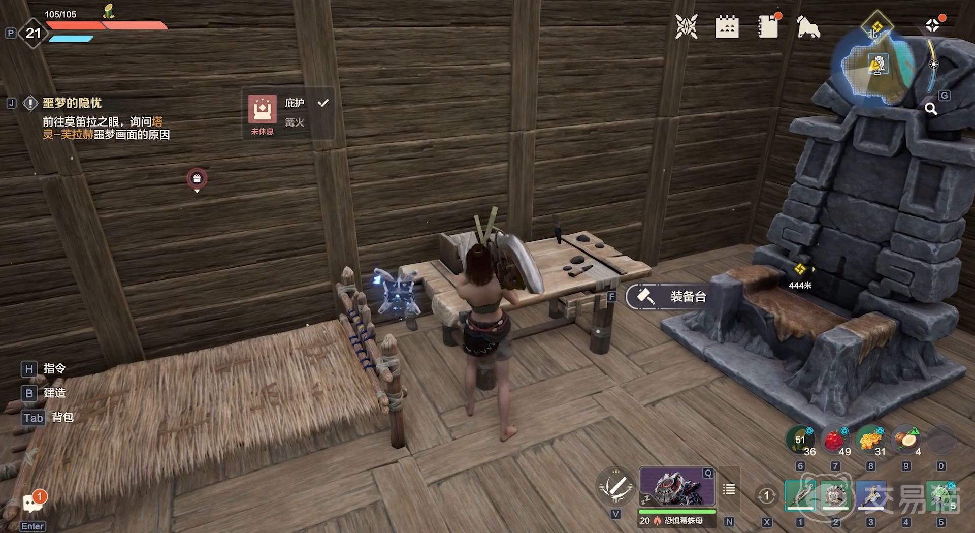 大伙在主线里放下家园中枢后,便会接到摆放装备台的任务,该任务只需在附近砍砍树,收集下其它的物资就能将装备台做出来,然后只要回家园里进行摆放就成。摆放好后大伙就能使用它了。装备台目前的功能有制造各类用具,为它们进行强化,以及维修所有用具。