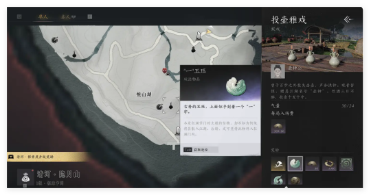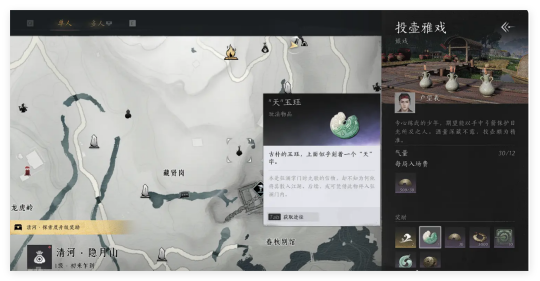 根据时一杯的指引,你需要收集四枚分别刻有“天”、“地”、“一”、“朝”四字的玉珏。这四枚玉珏不仅是开启狂澜门派大门的关键,更是证明你是否具备资格的试炼。这些玉珏散落在龙虎岭和慈心山院的隐秘角落,分别藏于那些不易察觉的地点。龙虎岭左下角的一片幽林中,阳光透过树叶洒下斑驳的光影,而玉珏就静静地躺在一块青苔覆盖的石头上;慈心山院左上角则是另一个玉珏的藏匿之地,光靠探索还远远不够,因为剩下的玉珏需要通过一项特别的活动投壶游戏来获得。