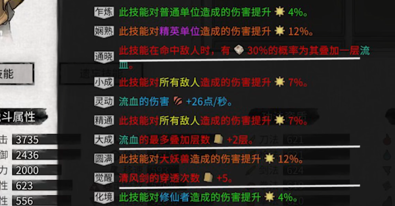 武技:发射额外剑气,场上流血层数大于8层时发射额外剑气,减少冷却时间,降低耗蓝。神功:选择剑神功,词条选择使用身法减少绝技6秒冷却。大法:选择剑大法,词条选择减少绝技冷却时间25%,减少身法冷却时间50%或25%。