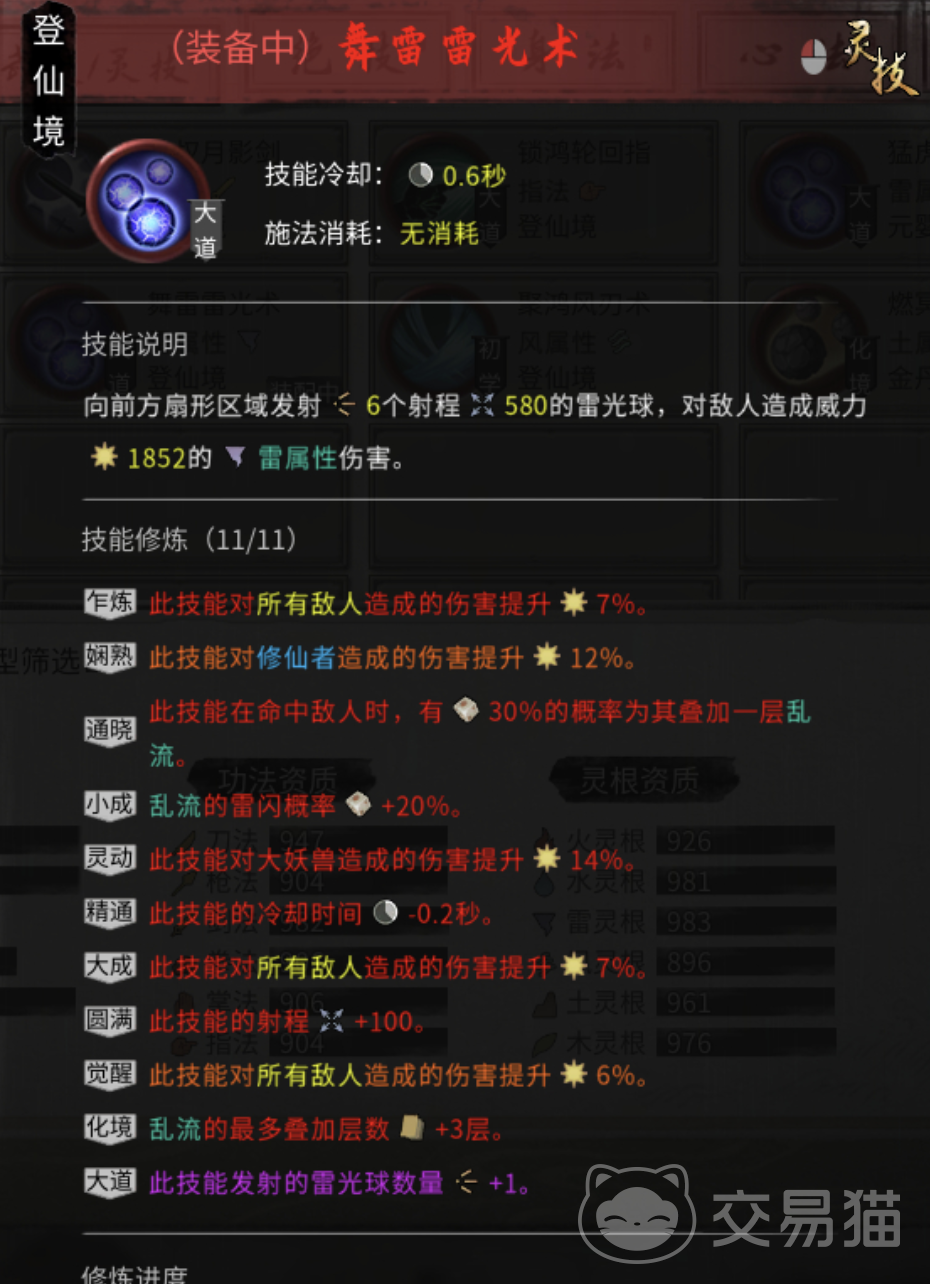 能搭配推荐包括灵技雷光术(雷球)、绝技鸣雷术(开花雷)和神通天雷劫。灵技雷光术是一项向前方发射雷光球的技能,能够对敌人造成1850的雷属性伤害,适合在敌人密集的区域使用。雷光术的射程为580,能够在较远的距离进行攻击,帮助雷修打击远程敌人。