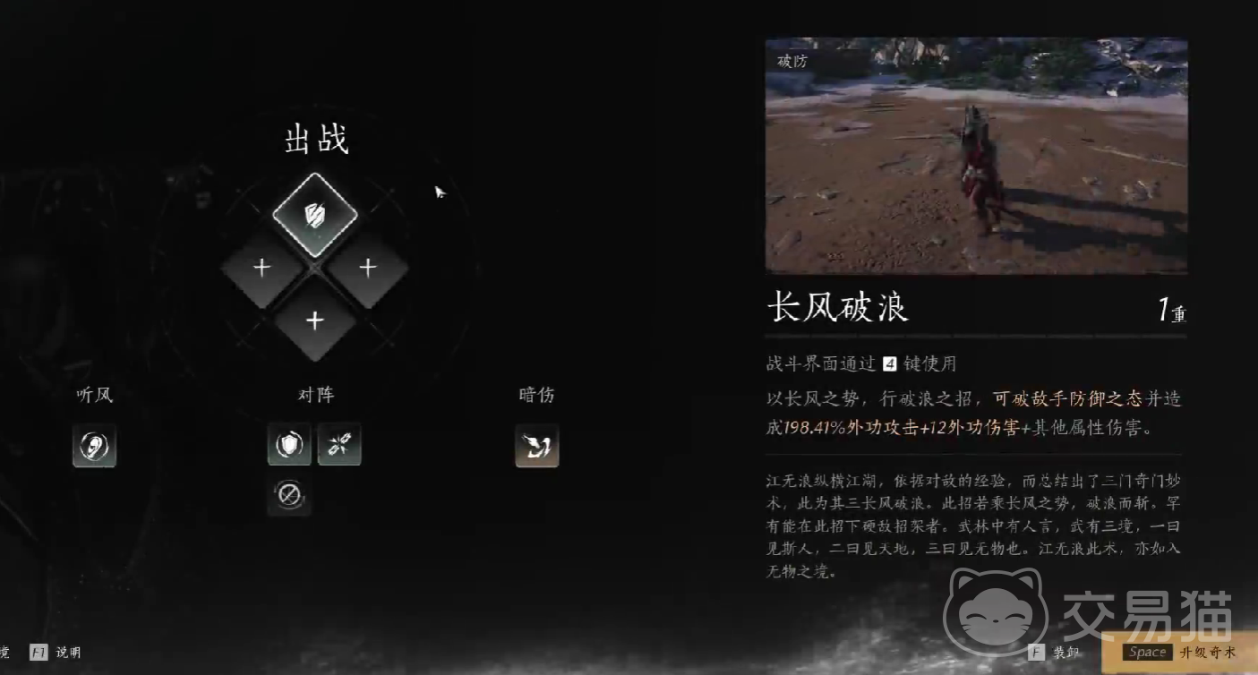 长风破浪属于破甲奇术,它能够对处于防御姿态的敌人造成高额度的破甲伤害,这个技能一般用于反制,也是游戏当中常见的盾反技能,在卡准时机使用长风破浪时,玩家还能够增强外功伤害数值。