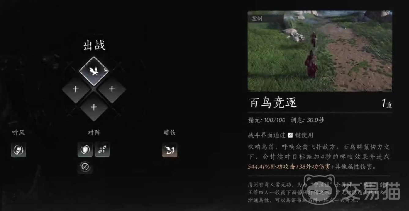 百鸟朝凤属于一个召唤系技能,当玩家释放百鸟朝凤时,可以换出飞禽,对指定方向区域内的敌人,造成高额度的外功伤害,在伤害判定时,敌人还会遭受到流血的dot效果,百鸟朝凤一般用于消耗。