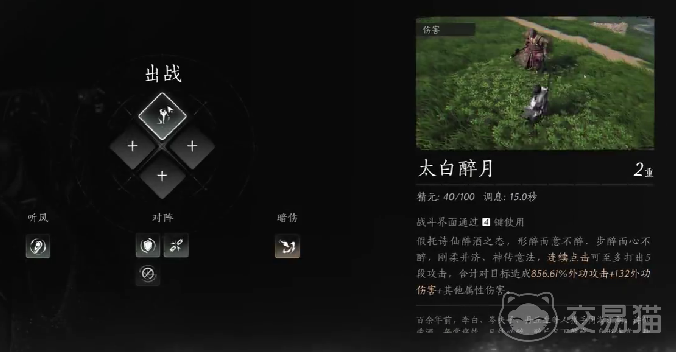 太白醉月则需要少侠通过饮酒的方式来获取,它可以让玩家处于醉酒状态,并且连续向前方发出五段进攻,不止如此,醉酒状态的闪避率是100%,玩家可以使用这个技能,来规避所有的致命伤害。