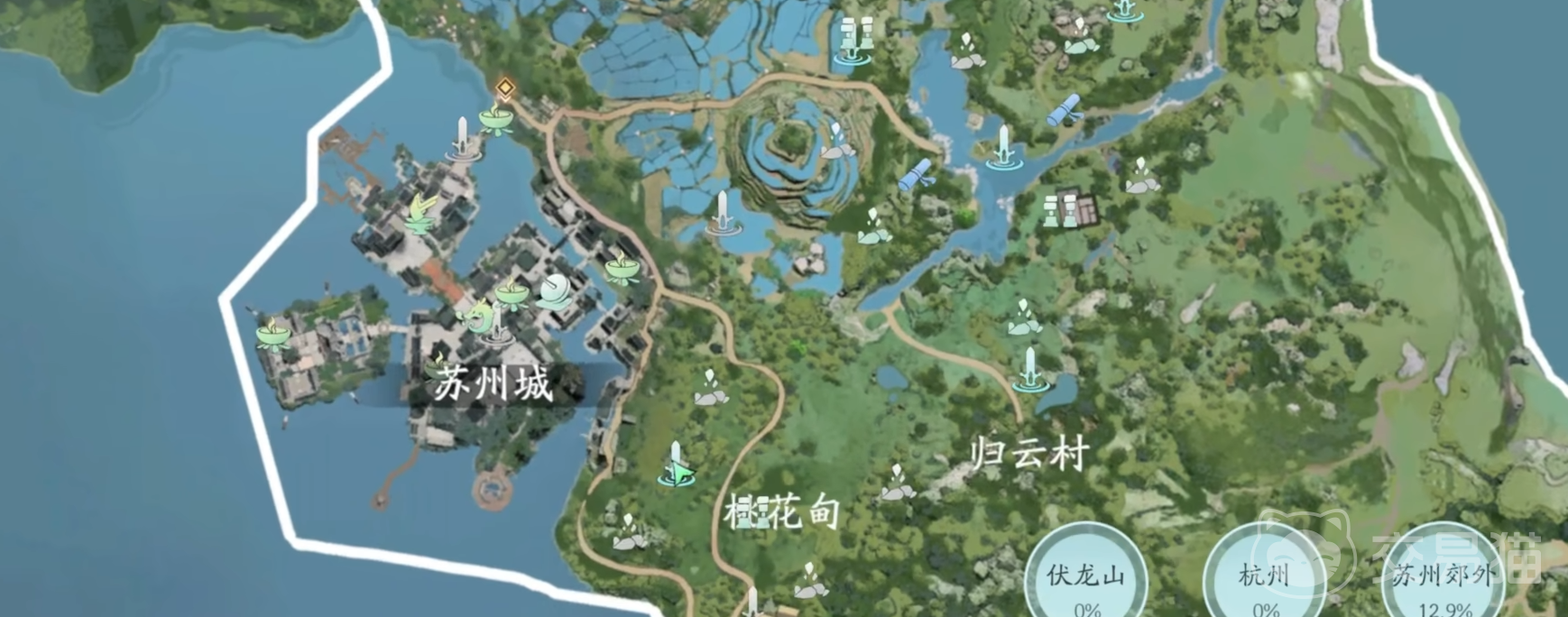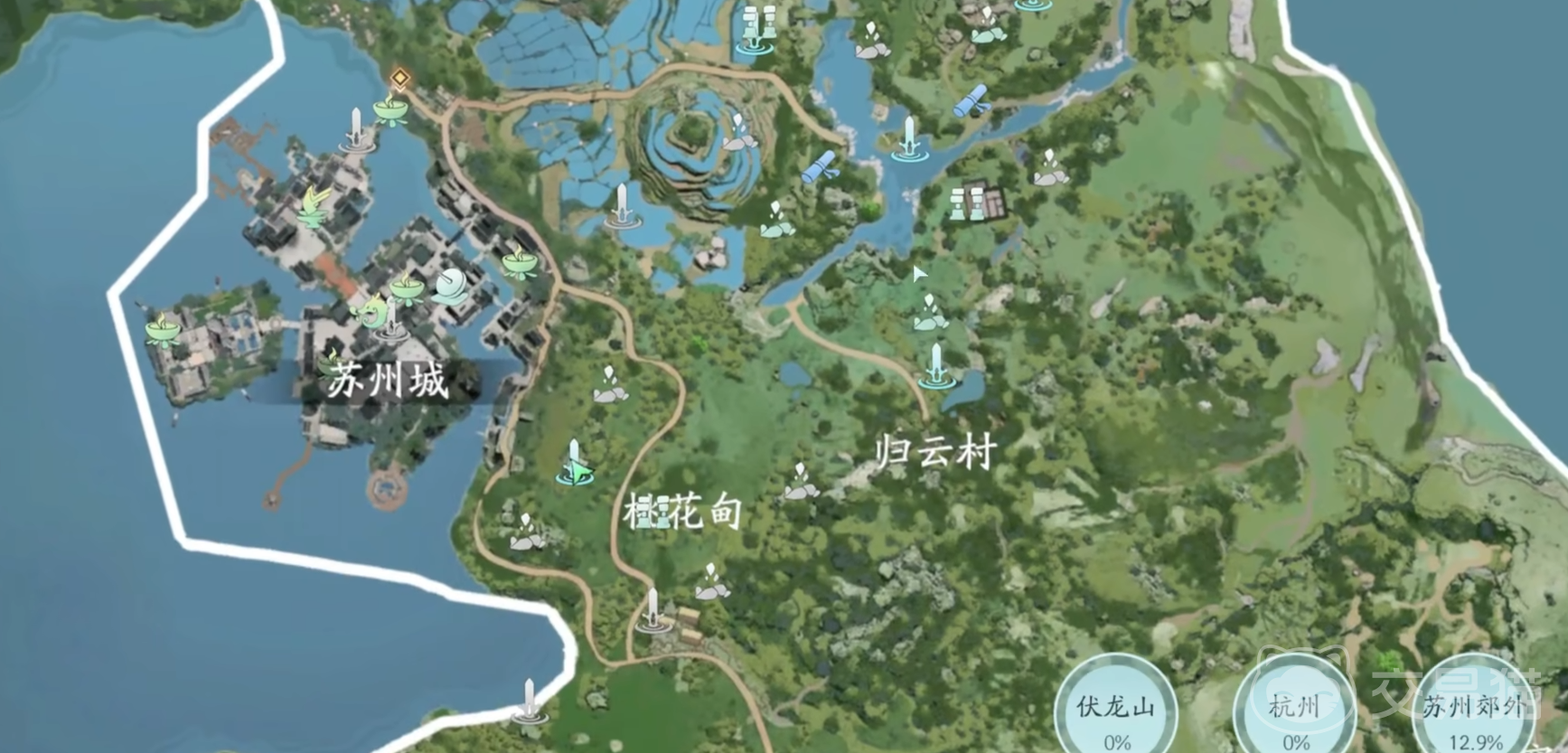 最后,整个地图中融入了一些现实中的地名和特色景点,如苏州、杭州、余杭、巢湖以及苗疆等。这些地点的设计都借鉴了现实中的特色,同时较为真实的场景搭建方案,给玩家带来一种真实的质感。