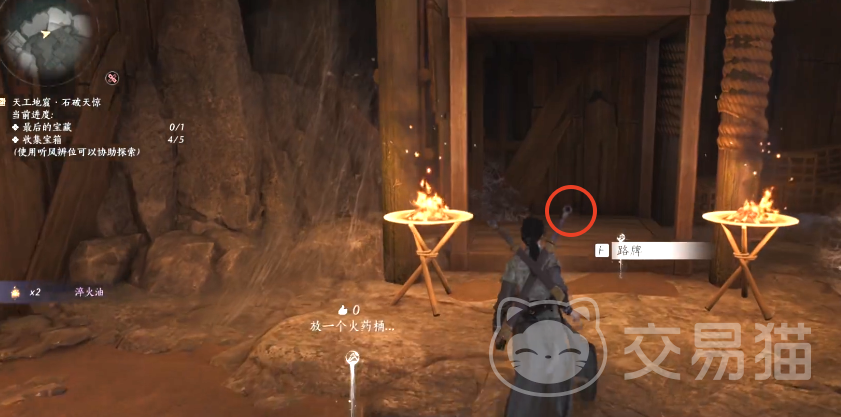 进入洞窟后,直接启动旁边的装置获得小型火药桶,利用这个火药桶炸开旁边的入口,具体操作是先将火药桶搬运到石洞旁边,拾取一旁的火箭袋,离远了引爆,然后获得后面的箱子。