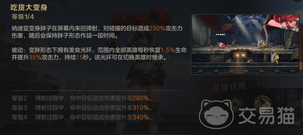 第二个技能为吃货大变身,在技能的加持下,她将被变身成为胖子状态,在地图上来回的弹射,会对命中的敌人造成一定的伤害数值,在攻击结束它依然会保持一定时间的胖子状态,而在此状态下如果能够触发幸福光环,那么则可以使友方每秒恢复生命值,并且提升一定的攻击力,辅助能力一流,这个光环也是可以继承在自己的队友身上的。如果运用好了完全可以利用这个技能帮助我方提供长时间的续航能力。
