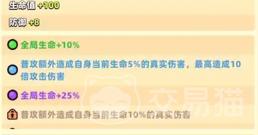 生命值可以增加100,防御值可以增加8,全局生命可以增加10%。普通攻击还可以额外,造成目前生命值大于5%的真实伤害最高就可以造成10倍的攻击伤害。是一个非常出色的道具。
