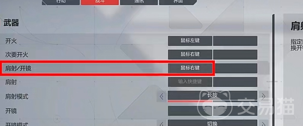 腰射键位也是没必要开启的键位,肩射和开镜这两键位最好设置成为一个操作键,习惯用鼠标就把开镜设置成右键使用,肩射设置成为长按鼠标右键,这样子2⃣️键位能区分开来,不会出现按错情况。