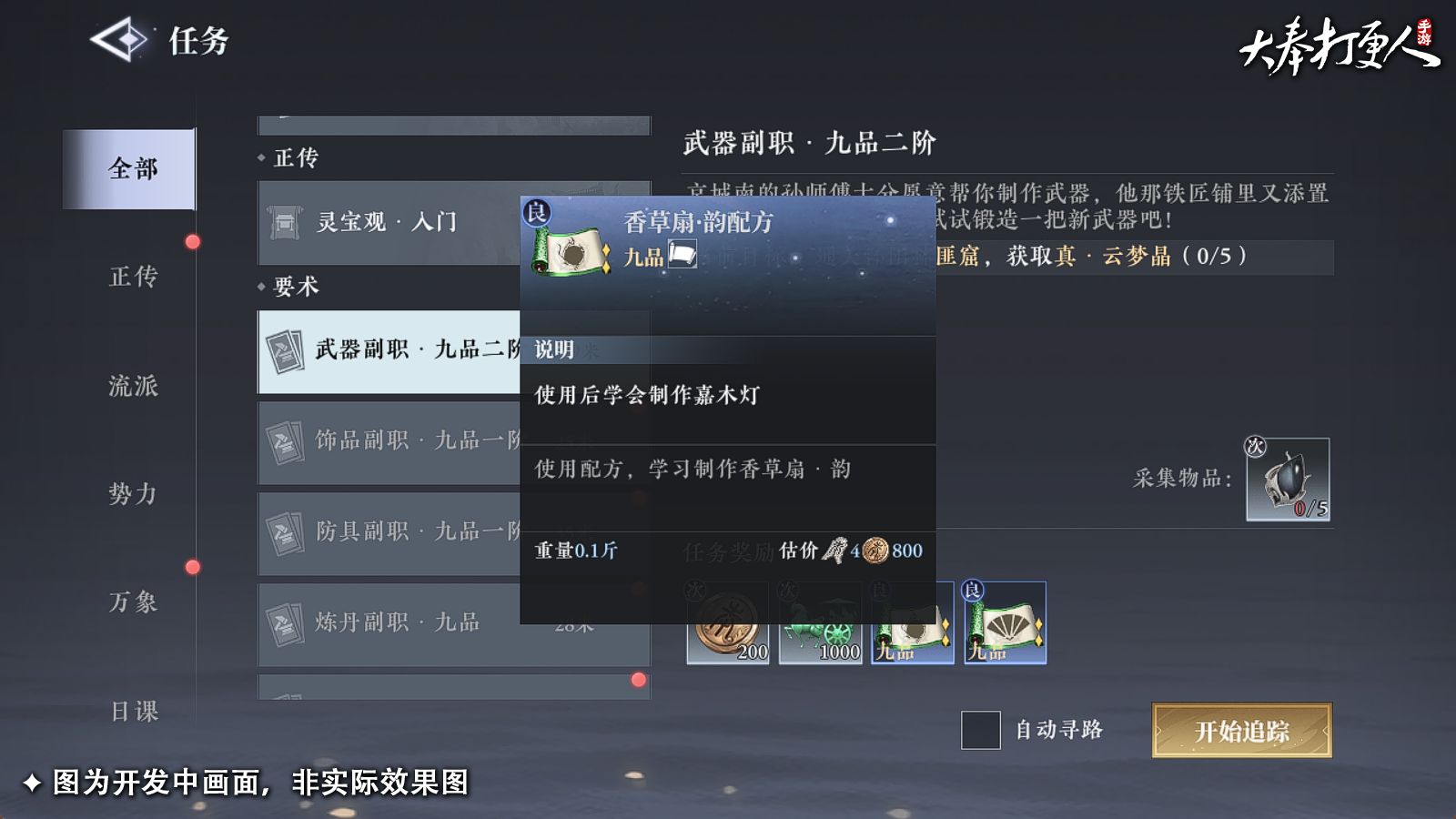 随着税银案的推进完成会解锁生产一类的副业,这时候我们就可以找到工匠孙师傅进行对话拜他为师,学习他锻造的手艺,完成系统要求的任务就可以得到基础的配方和制作手艺。配方有的我们看一下手上的材料够不够,不足的话就要去采集,基础锻造需要的矿石大家可以去藏金山采取,采集也是分为等级的,你锻炼的刀好需要采集的物品品质就更高,所以采集的等级大家也要同步跟上,如果需要特殊材料可以做指定的任务或者去商店,材料够了回到制作台开始做就OK了,还有武器拍卖行。