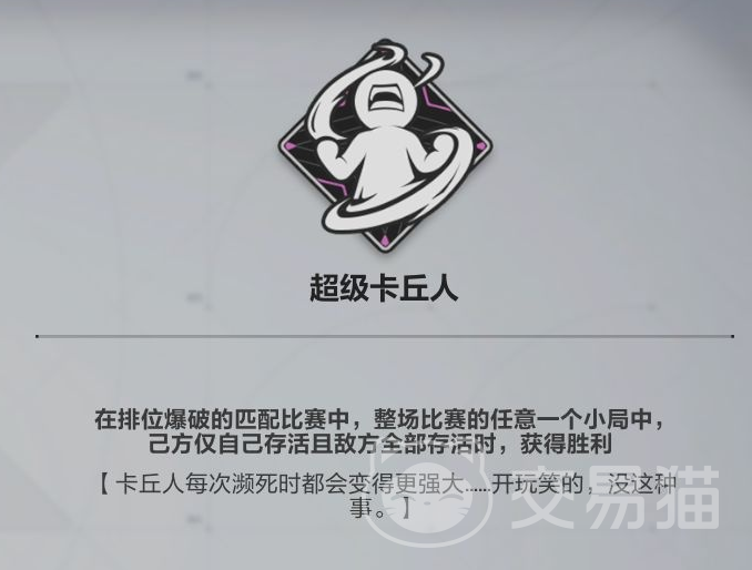 然后是【空摘】,是普通或排位爆破中击倒或者击败处于空中或者飞行状态的对手,【你以为我打不中】则要在这两个玩法中自己剩余1点生命值时赢得当前回合的胜利。【铜皮铁骨】要在一回合在受到五名不同对手的攻击后保证仍然存活,最后一个时【同归于尽】,在自己被击败的同时也解决正在攻击你的敌人。以上介绍的这十五个,是目前被证实的全部隐藏,可能随着后续的更新和内容增加,数量也会慢慢变多。