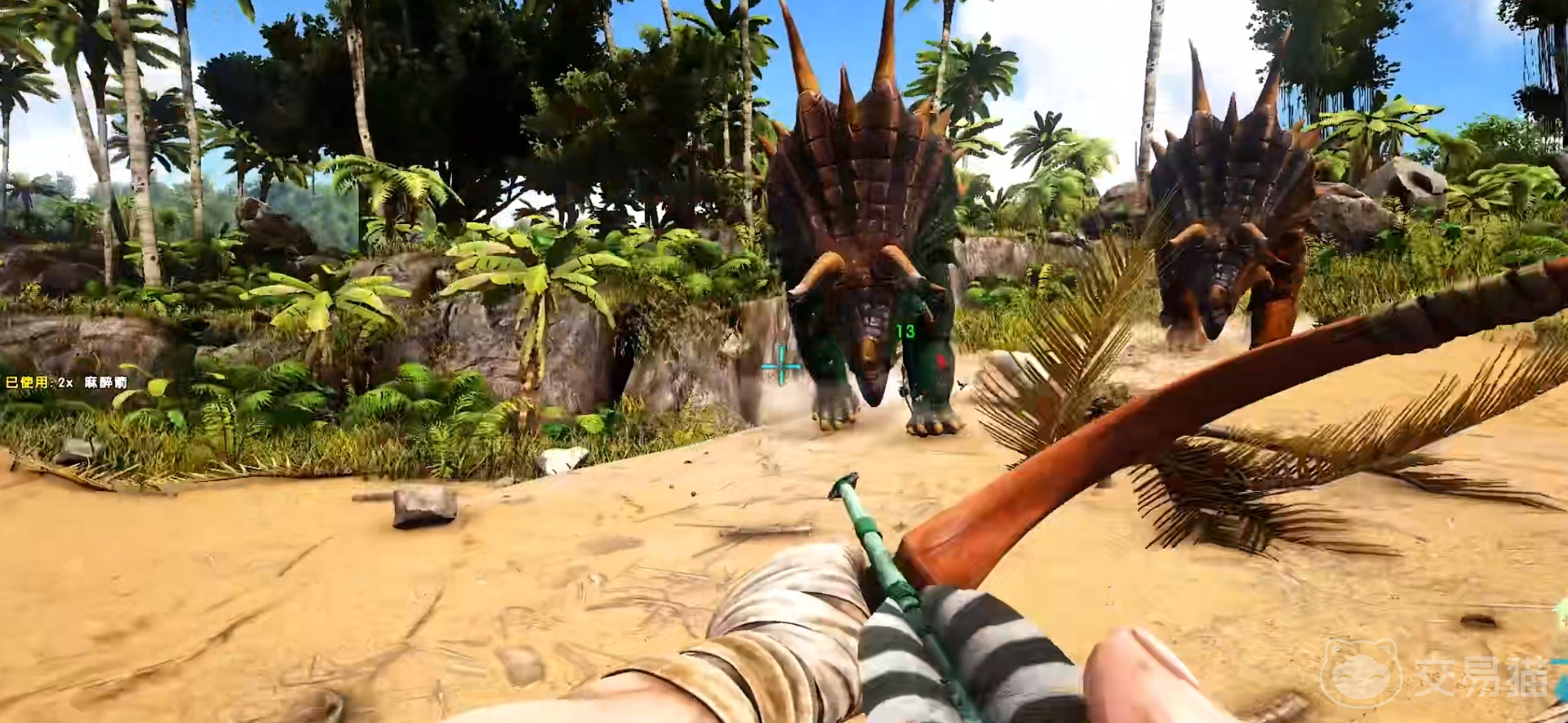 想要驯服这个生物很简单,主要可以使用弹弓,麻醉箭和麻醉飞镖等等来风筝,千万注意别跑到他的同伴周围,否则全部都会围攻过来。这样风筝的后果就是该生物的体力被耗光,正式进入老年人模式,也就是行走速度和动作非常缓慢,这个时候怎么打都可以,只要不打头部,其头部有着将近80%的免伤,所以在地图上经常看到双脊龙或者是迅猛龙惨死在三角龙面前。
