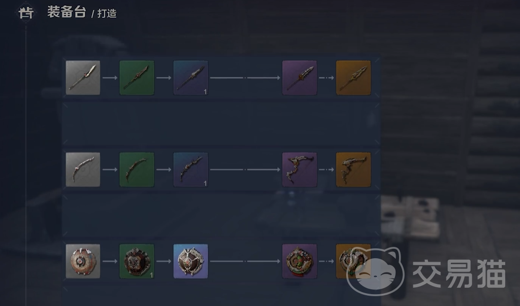 在装备台的操作界面里面,大家可以看到游戏中的装备一共分为5种品级,由5种颜色来代替,从低到高分别为白、绿、蓝、紫、橙。通常大家初期拿到的都是白色的装备,然后就需要从装备台的界面中查看每一件装备的成长路线。在选中你想要打造的装备之后,可以从右下角的位置看到升级该装备所需要的详细材料和数量。