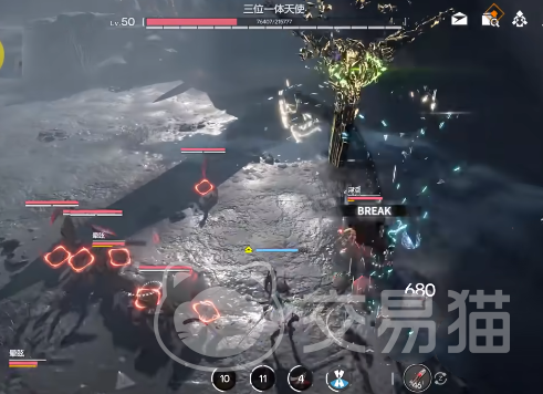 进入第三个阶段之后天使攻击方式就比较复杂。其隐身技能使得玩家很难锁定目标,追踪弹、球形攻击则加大了作战难度。处于隐身状态的天使不能直接受到攻击,需要玩家凭借范围攻击技能才能迫使天使离开。现阶段陈千语AOE技能特别重要,能有效弱化天使韧性条让天使出现。同时天使的追踪弹对于团队血量也有很大威胁,特别是在AI操纵下队友很容易受到频繁打击。保证团队生存能力至关重要,这个时候大山治疗技能可以给团队持续支援和保持战斗节奏。