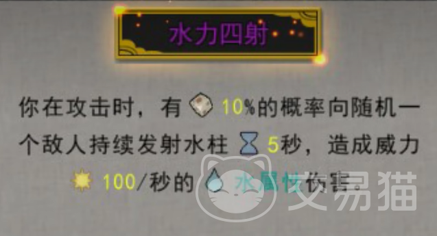 听名字可能有点搞笑,但“水力四射”的强度可一点都不含糊。攻击时有概率召唤出一道水柱,对敌人造成持续性伤害。不要小看这个伤害叠加效果,在高频攻击的加持下,水力四射可以迅速拉高你的输出总量,成为团队战的主要火力来源。它的亮点在于高触发率和持续输出能力,非常适合喜欢AOE的玩家。