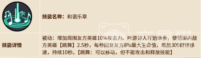 吟游诗人在游戏中有着高血量和移动速度设定,这使得它在战场上拥有不错的生存能力和灵活性,尤其是在需要快速支援或撤退的情况下,它的核心技能和谐乐章是一项极为强大的辅助工具,它不仅能够提升周围队友的攻击力,还能为队伍提供持续的生命恢复效果以及增加全体成员的移动速度,当技能达到一星级时,它可以被动地提高附近盟友3%的攻击力,同时在激活期间持续10秒时间之内,每秒恢复友军6%的最大生命值,并且提升200点群体移速。